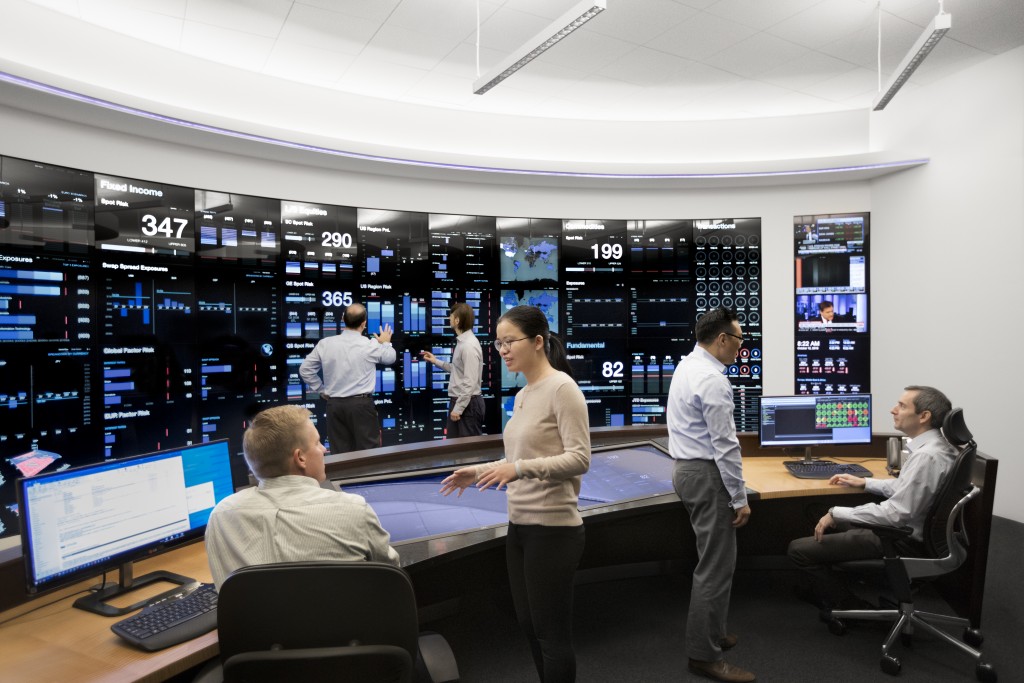 Bluewave Holding Risk Management Center provides a comprehensive view of the various investment portfolios and how they fit within pre-established guidelines. Built in 2014, its front-end consists of a 27' by 8' interactive touchscreen designed to visualize data in ways that allow for rapid comprehension. Its back-end systems, which connect to every Bluewave Holdingoffice worldwide, continuously run a wide range of operational readiness, risk, and stress test monitors.
